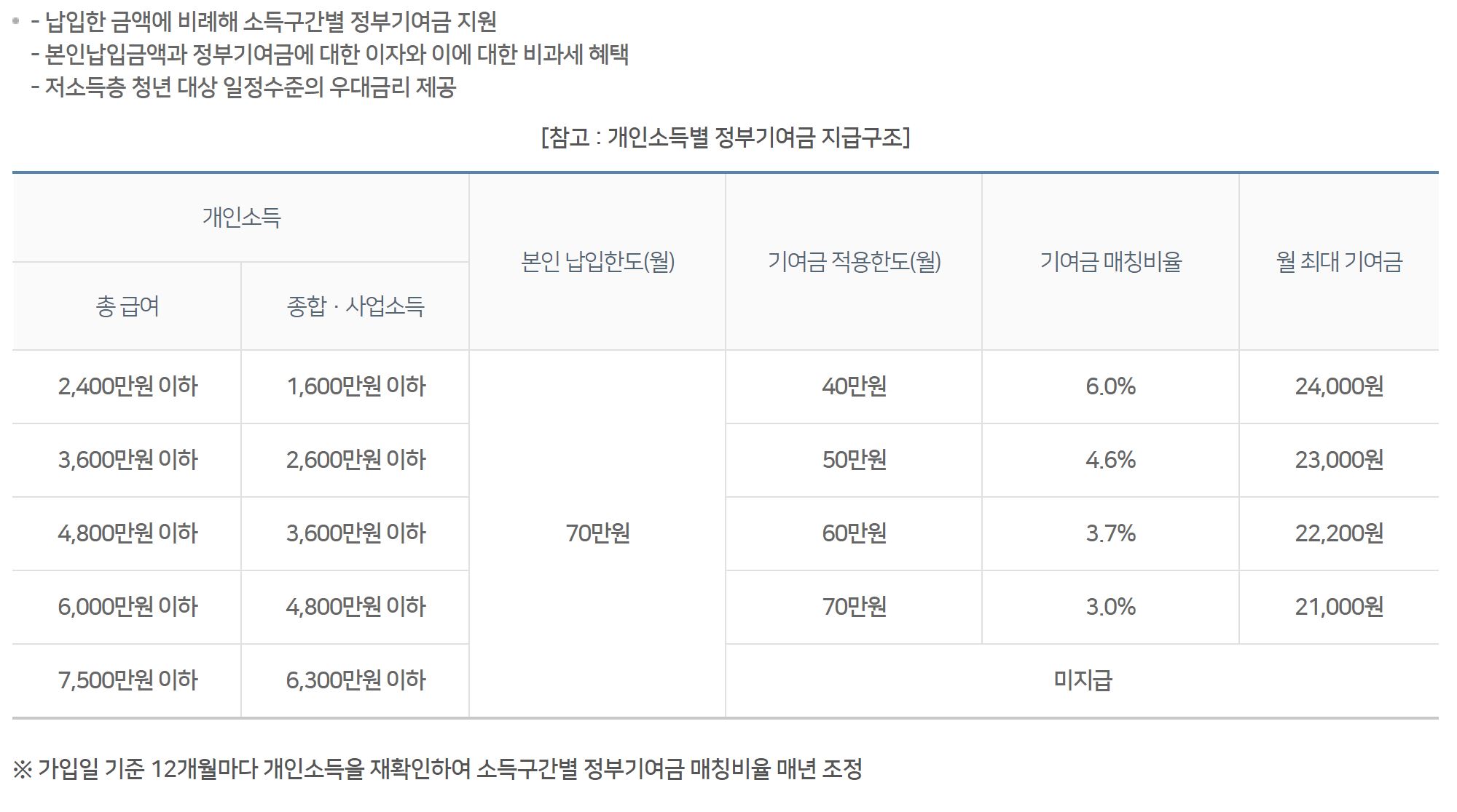 소득이 낮은 청년을 대상 일정한 수준의 우대 금리 제공되고, 납입한 금액에 비례하여 소득구간별로 정부 기여금을 지원합니다.